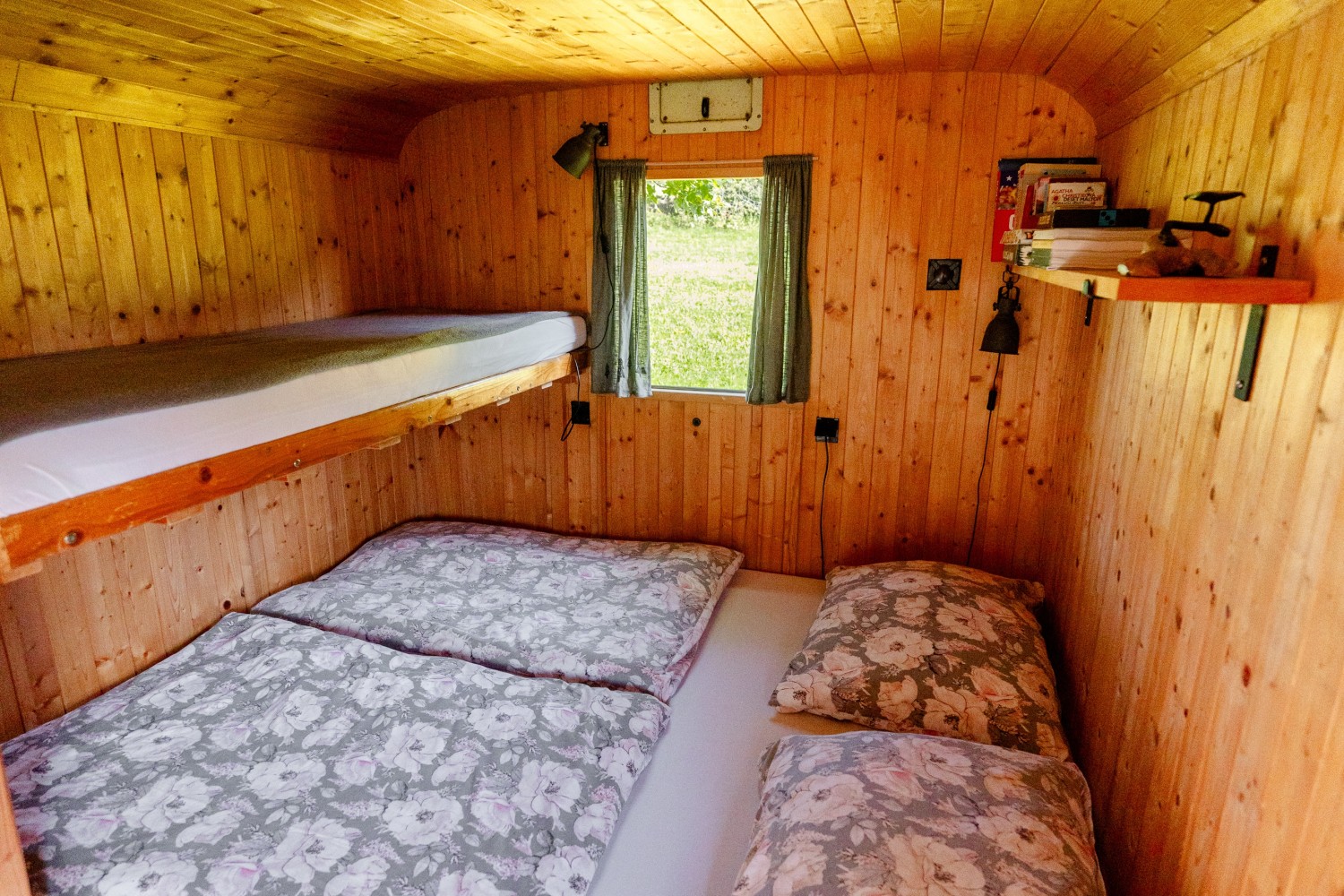 Šumavská maringotka zvládne ubytovat až čtyřčlennou rodinu. K dispozici je 2x2 metry velká postel, nad níž je ještě jednolůžko, co by palanda. Jako další místo na spaní se pak dá rozložit pohovka. Toaleta a sprcha jsou umístěny v přilehlé usedlosti, kterou majitelé využívají k rekreačním účelům. Kromě toho tu ale nevede žádná hlavní turistická trasa, nebo silnice a tak se vám tu bude spát opravdu dobře. V zimě si přitopíte plynovými kamny.